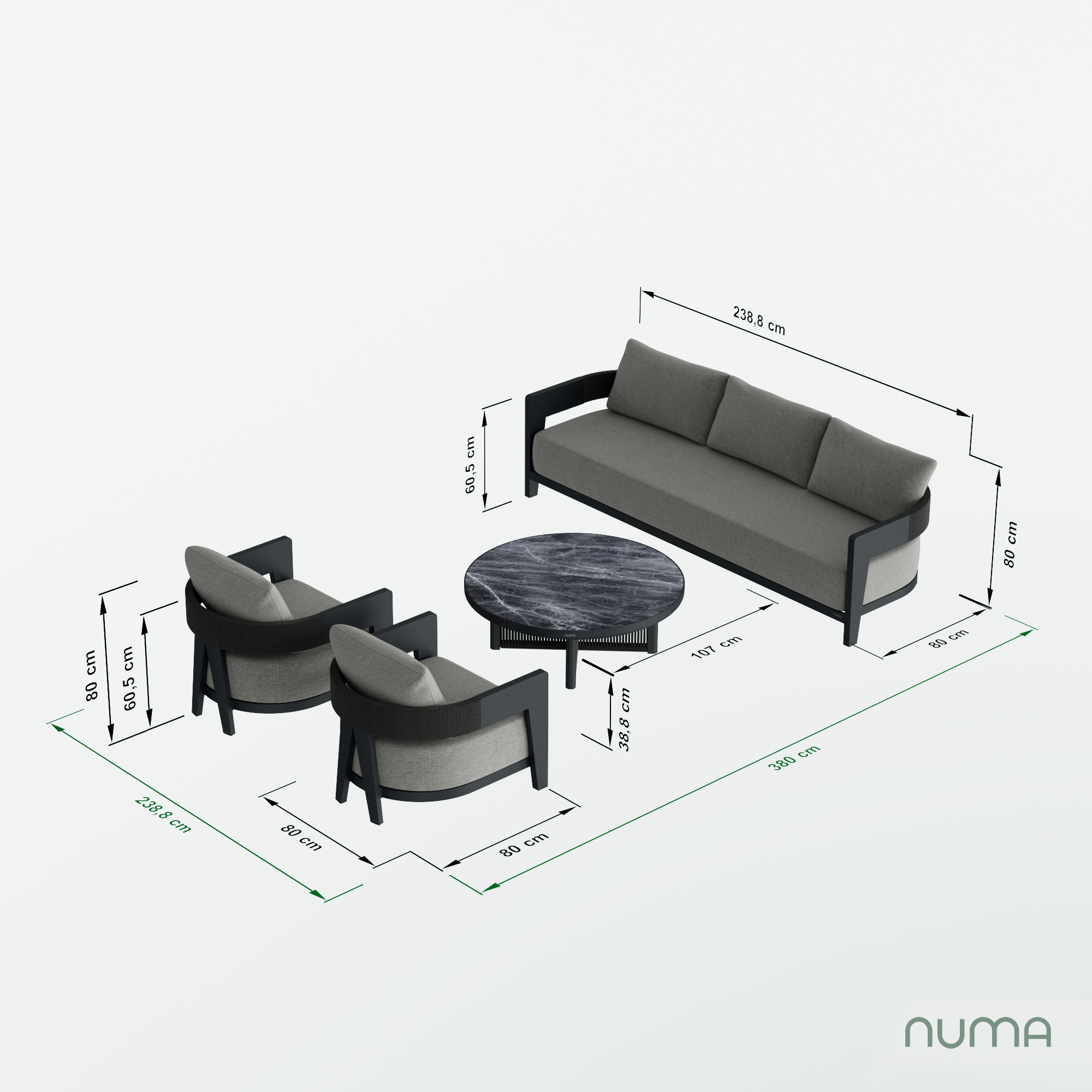 The Ultimate Social Configuration This curated set brings together the best of the Harbor range—the grand 3-seater sofa and two single seat sofas—to create a balanced, conversational layout. Defined by a modern open-back silhouette and a refined rope detail wrapping the upper frame, the Harbor pieces maintain a light, airy feel even on smaller terraces. The 3-seater features our extra-deep base cushions, providing a plush "sink-in" experience that is perfectly complemented by the supportive, architectural frame of the single sofas.