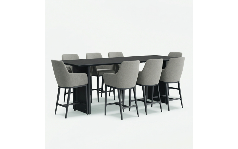 Seamless Aluminum Craftsmanship The Belgravia Bar Table is a masterclass in minimalist durability, scaled here to accommodate eight guests with ease. Constructed entirely from high-grade, powder-coated aluminum, it offers a uniform, sleek aesthetic that perfectly matches the Hudson frames. This full-aluminum build ensures the table is: