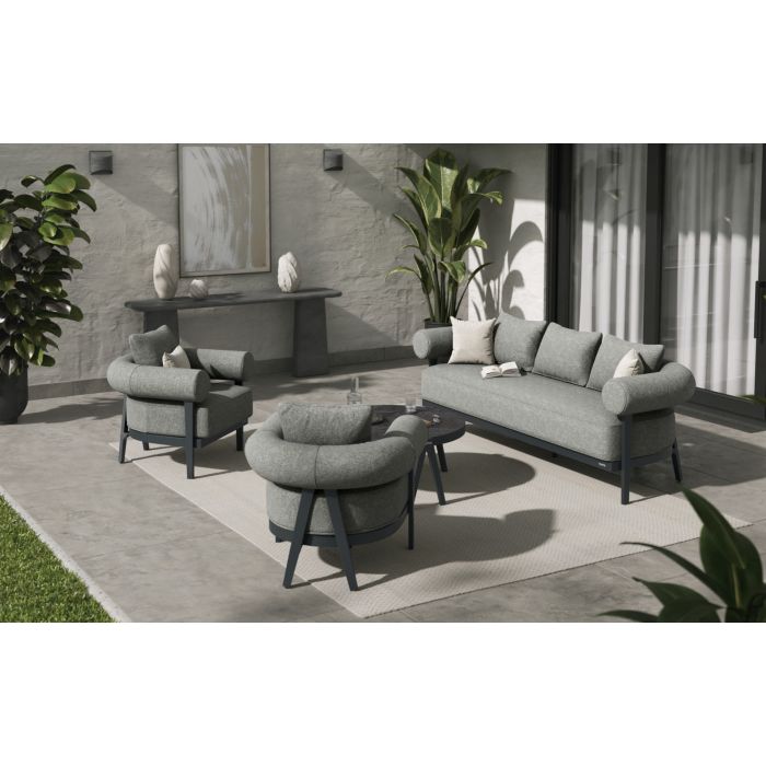 This 3-seater sofa, twin armchair and round table set is the ultimate hangout spot for those epic gatherings with your friends and family. Its head-turning design will instantly elevate your outdoor space, creating a vibe that's both stylish and inviting. With its sturdy aluminum welded frame and signature A silhouette, this set is built to last, providing maximum comfort for you and your guests for years to come.