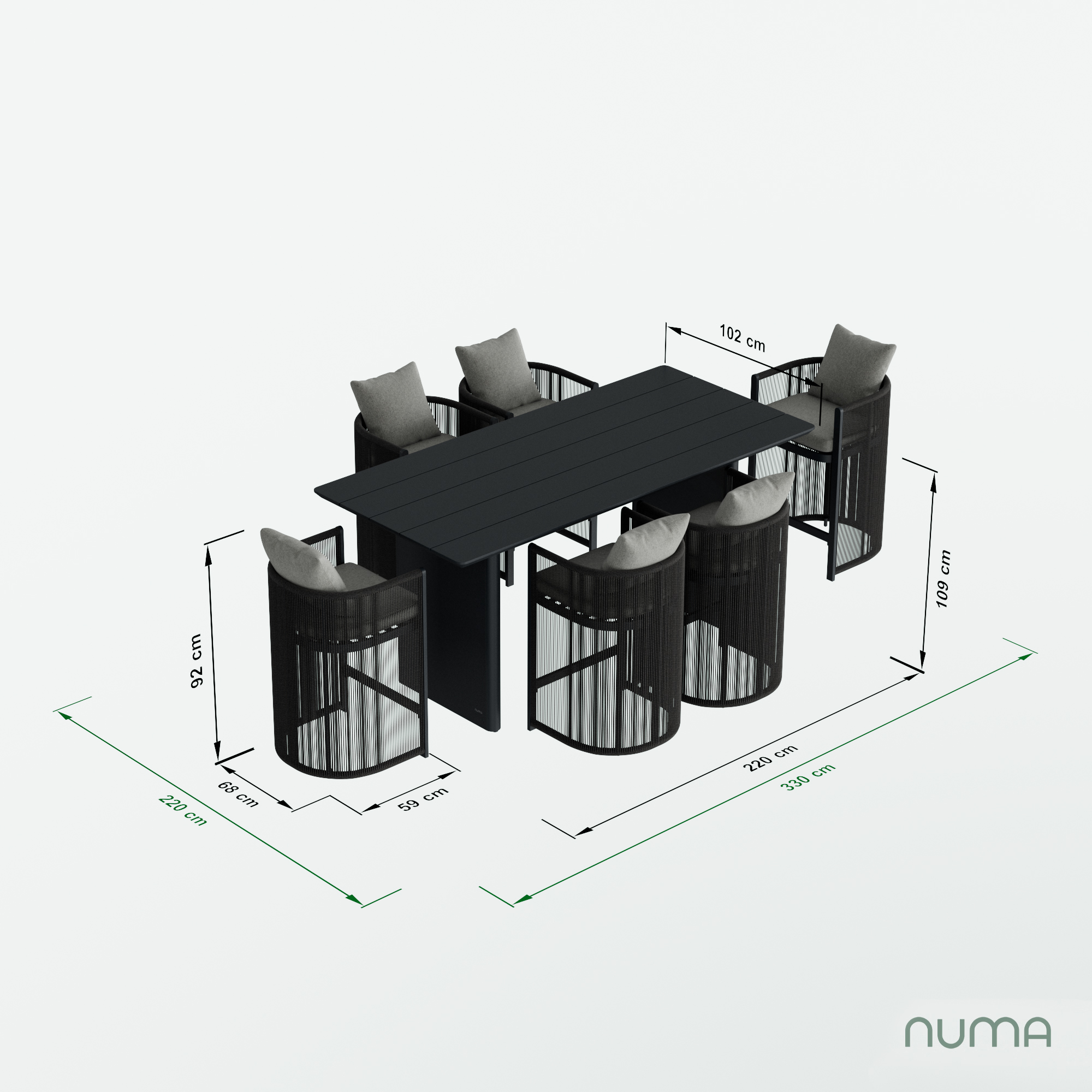 Industrial Lines & Textural Detail The Soho & Belgravia set is designed for those who want their outdoor space to make a statement. The Soho Bar Stools are the centerpiece of this collection, defined by their bold, linear aluminum frames and a sophisticated rope design woven across the backrest. This tactile element softens the industrial aesthetic, providing a premium, handcrafted feel that distinguishes the Soho from standard outdoor seating. Surrounding the grand Belgravia Bar Table, this set offers a cohesive, high-end look for any outdoor kitchen or poolside bar.